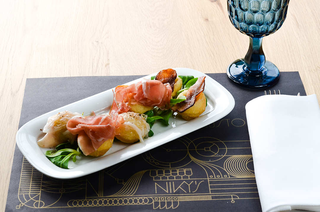 6 sfere di pasta di pizza fritta, guarnite con: prosciutto crudo di Parma, lardo Trentino e guanciale croccante
