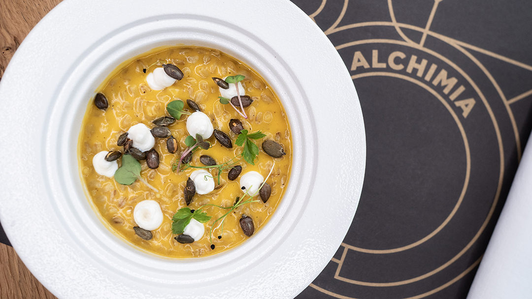 Abbiamo scelto l'orzo per creare un'esperienza cremosa e avvolgente. Viene risottato in una soffice crema di zucca, esaltato dalla morbidezza della ricotta di montagna e da un tocco di croccantezza dato dai semi di zucca tostati. Chi ama la mantecatura del risotto non potrà resistere a questa specialità