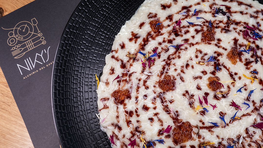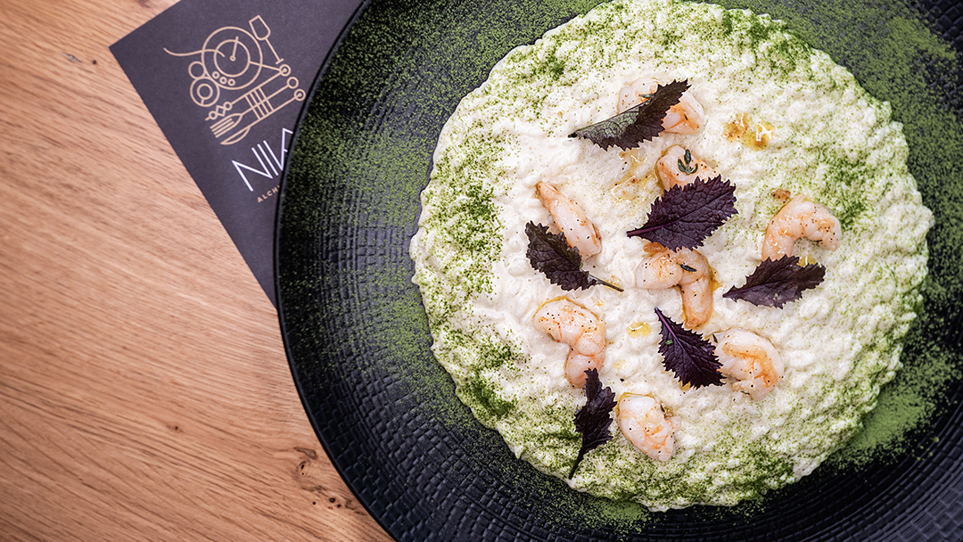 La cremosità della robiola incontra le note fresche di maggiorana e buccia di limone. Un risotto arricchito da gamberi spadellati al timo e dal tocco aromatico del prezzemolo