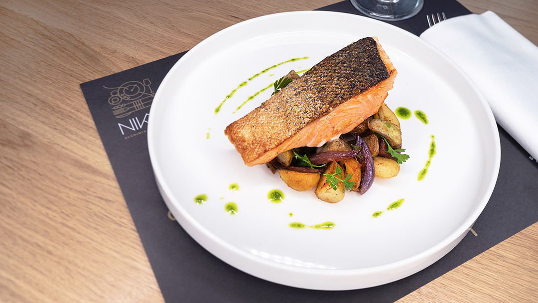 Salmone rosé cotto alla griglia servito su un gröstl di patate novelle, carciofi* e cipolla rossa. Mare e terra si incontrano in un unico piatto