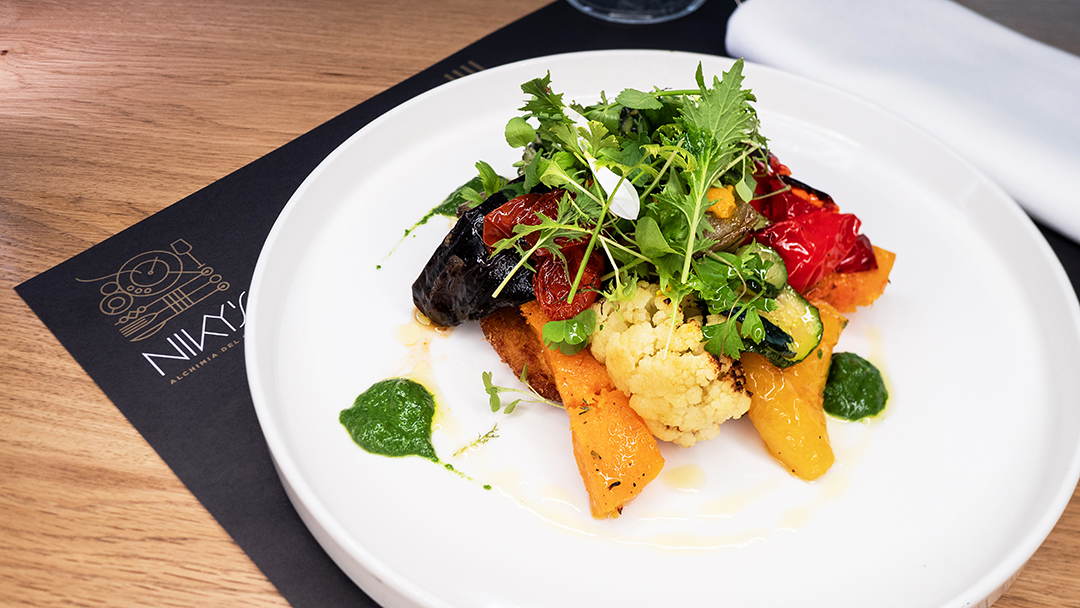 Verdure di stagione cotte al forno condite con olio extra vergine alle erbette. Accompagnato da una purea di spinaci insieme al nostro tortello di patate*