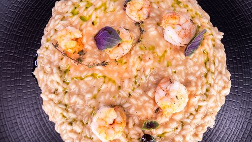 Risotto mantecato con una saporita bisque di gamberi. Con gamberi* spadellati al timo e dal tocco aromatico del prezzemolo