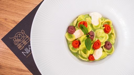 Orecchiette* con salsa di broccolo, pâté di olive taggiasche, mousse di scamorza e pesto di pomodori semi dry. Un intreccio di sapori mediterranei, completato da foglie di basilico di montagna